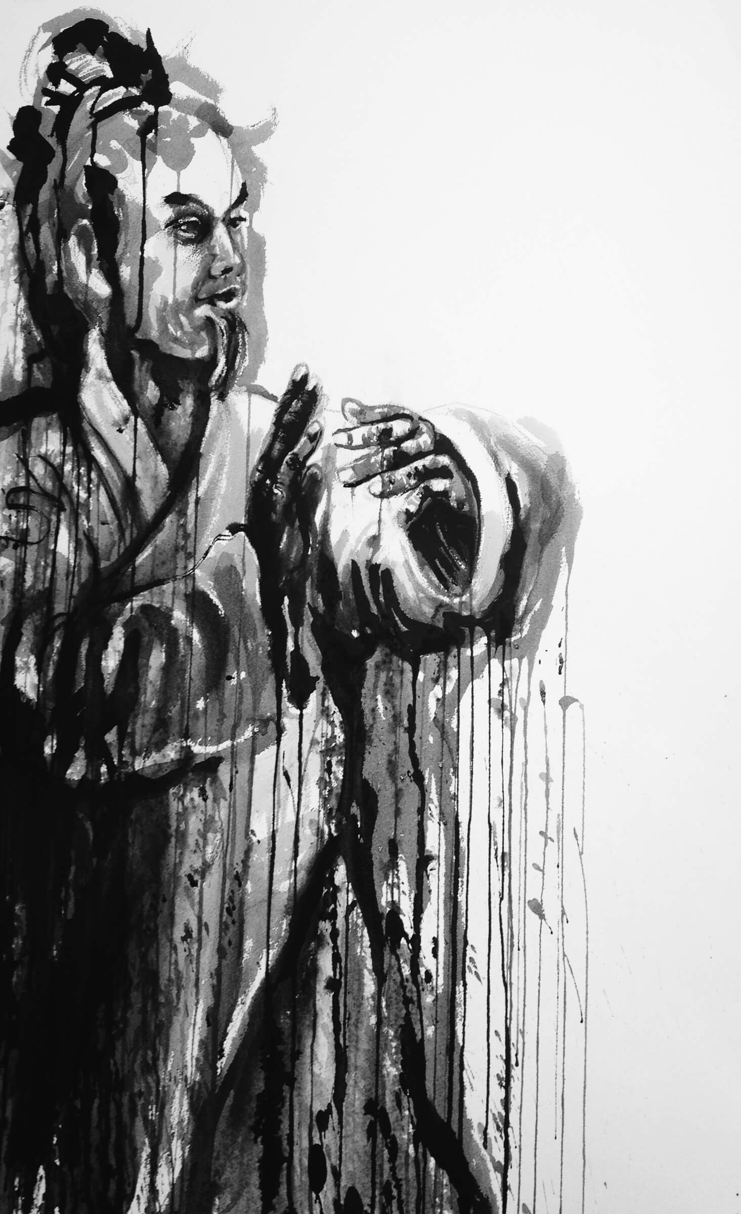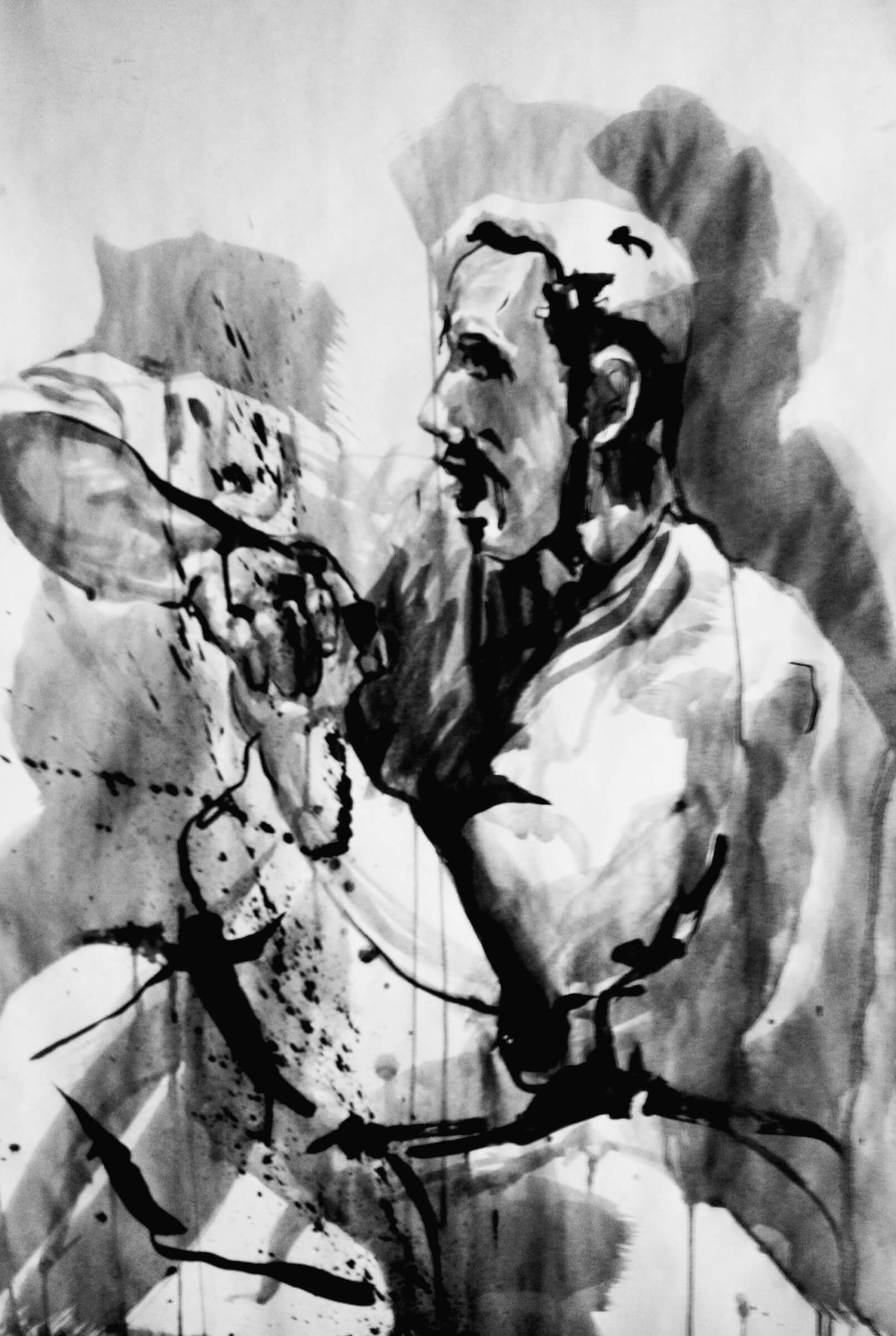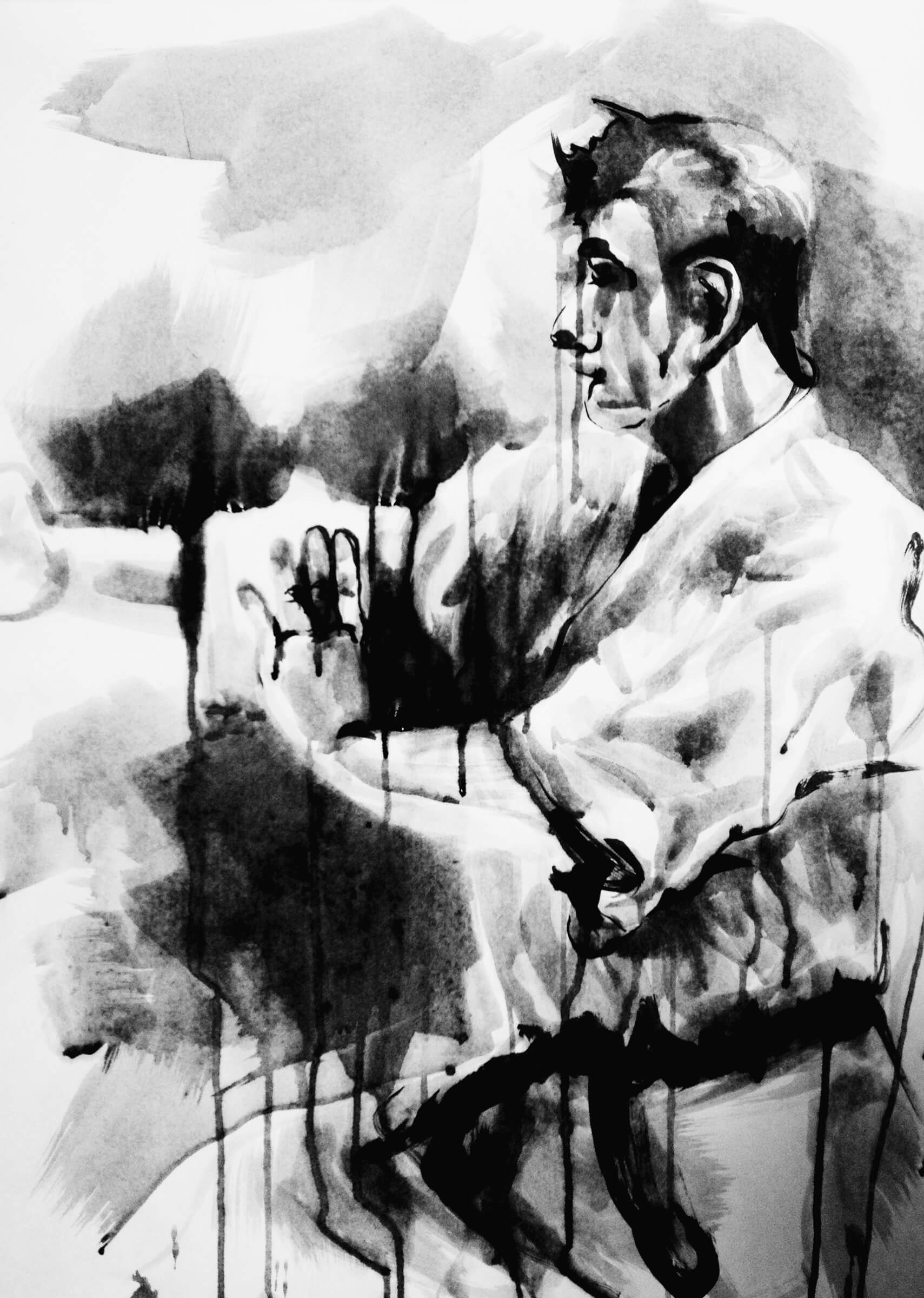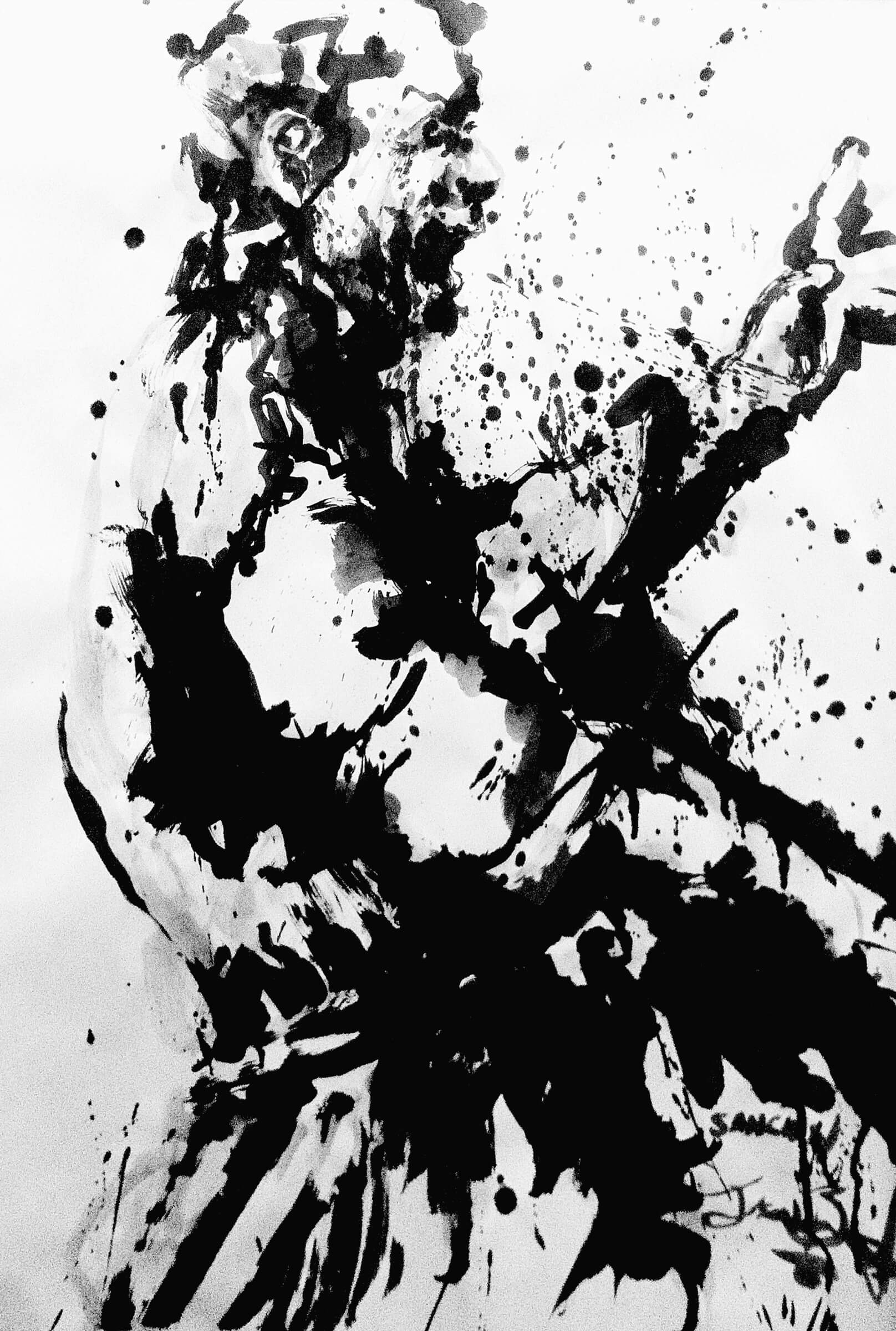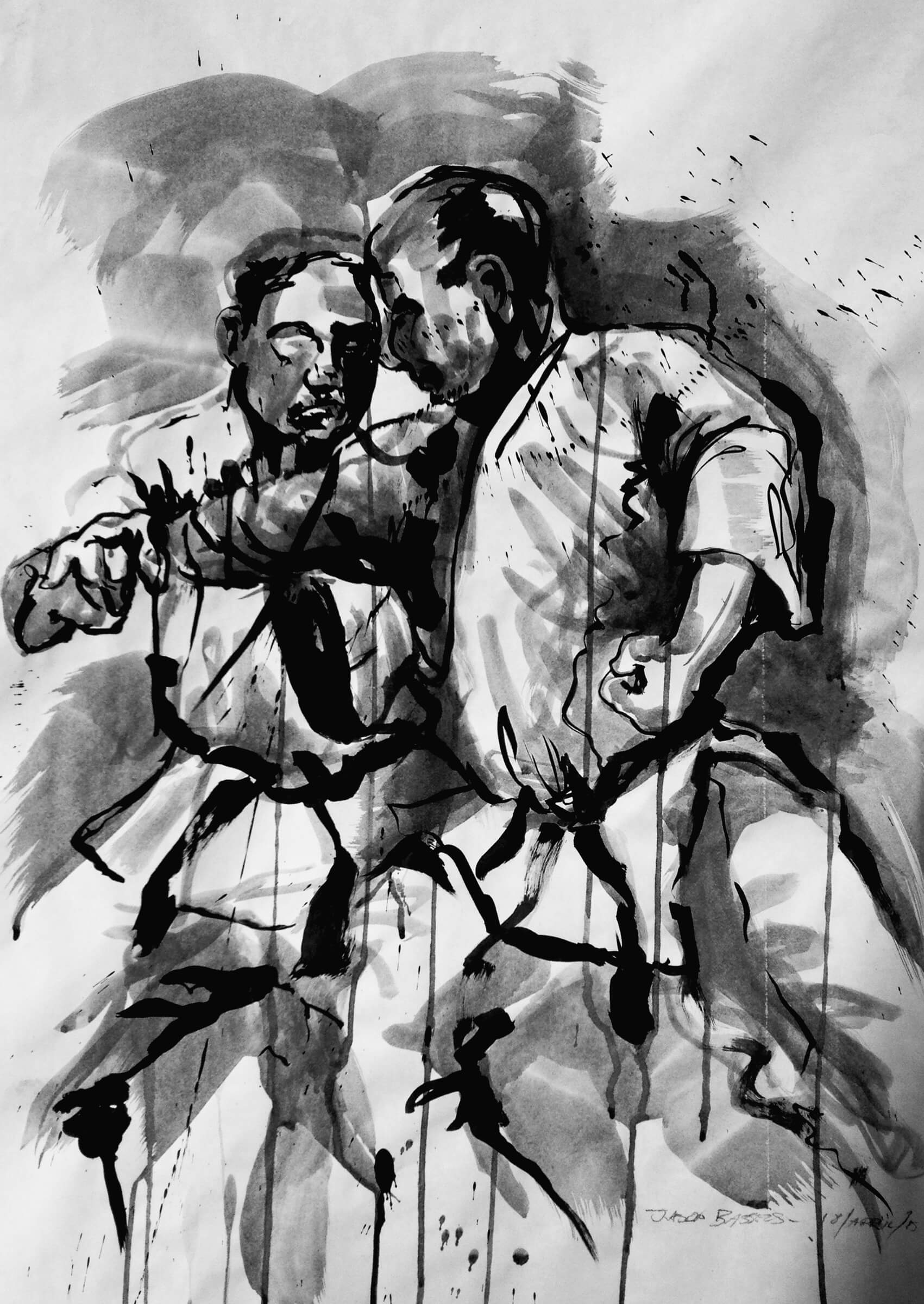 This period was a free form of painting in acrylic on canvas and ink on newsprint indicative of early American abstraction through which the violent energy of the paintings manifested the figures in it. This period revealed the possibility that fighting wasn’t a skill or behaviour but a medium from which they are created, and that the study of martial arts was an art, a theme, a radical alternative to understanding fighting in a way our eyes can’t see, as though we are all born with the same learning obstacle. I saw martial arts like the black crayon that helps people understand something that at first appears distorted, a way of providing texture to the contours of a large feature of human nature we otherwise outlaw and yet celebrate almost everywhere.