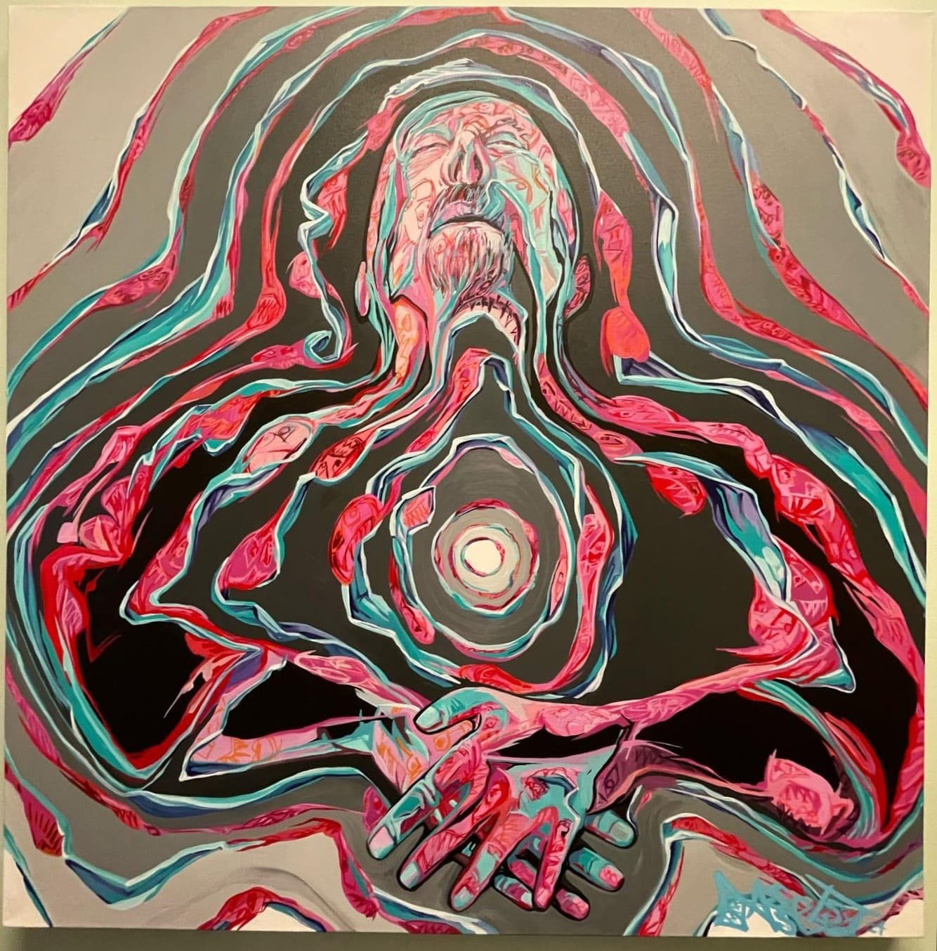 The last painting is The Leap Beyond Torii. Torii gates are traditional Japanese gates found at shrines and other sacred places in Japan and around the world. They represent philosophical ideologies—not religious ones, but metaphysical.